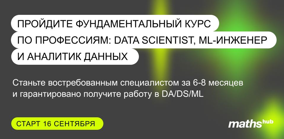 | | | | 16 сентября — это день, когда вы сможете начать свой путь к карьерному росту в данных и машинном обучении вместе с Mathshub. Не упустите возможность получить фундаментальное образование и гарантировано получить работу в этой сфере. | | | | | | | | ПРЕИМУЩЕСТВА ПРОФЕССИЙ АНАЛИТИК ДАННЫХ, DATA SCIENTIST И ML-ИНЖЕНЕР: | | | | | Высокий спрос на специалистов в данных и машинном обучении | | | | Возможность работы в различных отраслях | | | | Возможность создавать реальные проекты и получать результаты | | | | Возможность развивать свои навыки и карьеру. | | | | ПРОГРАММА ПОДОЙДЁТ ВАМ, ЕСЛИ ВЫ: - Студент, и хотите освоить профессию из сферы анализа данных и машинного обучения с нуля