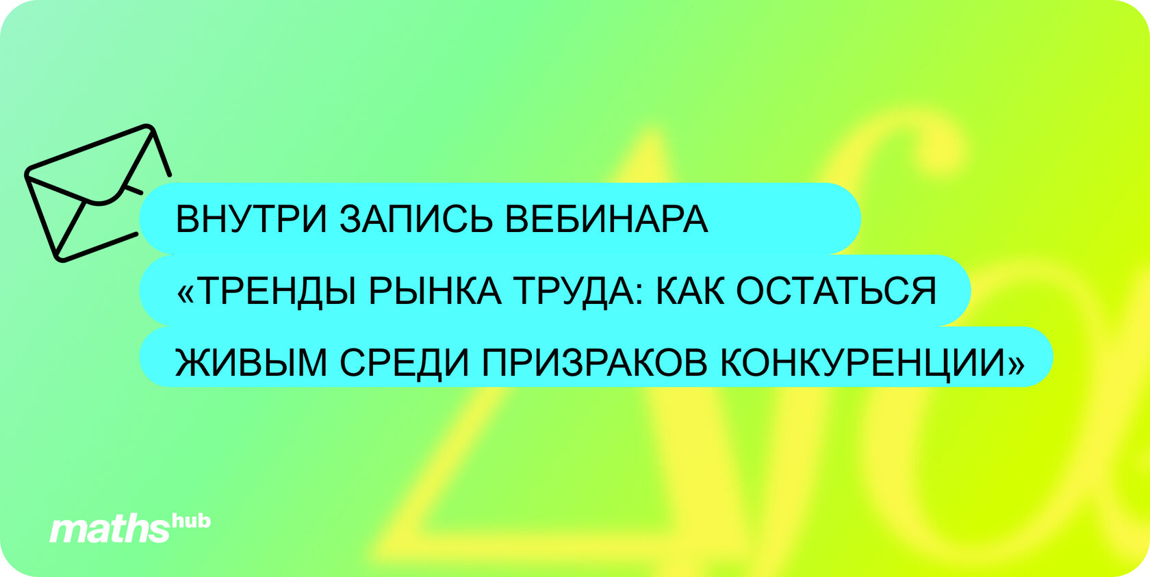 | | Привет! | | Спасибо, что были с нами на вебинаре «Тренды рынка труда: как остаться живым среди призраков конкуренции». Делимся записью вебинара. | | | | | | | | 🎁 И также дарим гайд по поиску работы в IT, который составили совместно с карьерными коучами Mathshub.